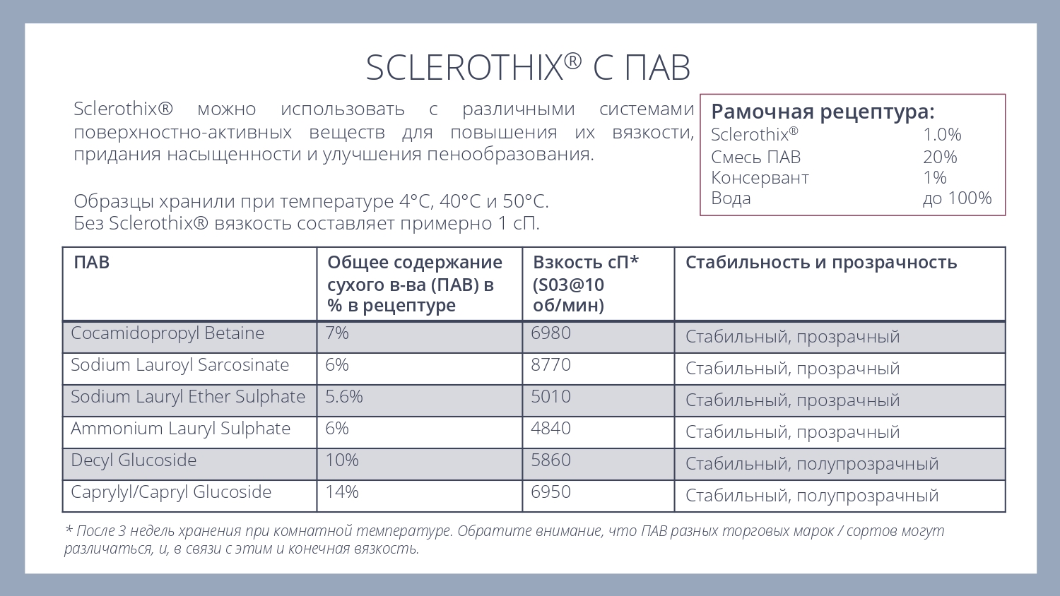 Sclerothix является эффективной добавкой для улучшения суспендирования (подвешивания) различных частиц - скрабов, глин или пигментов, в том числе в составе моющих систем.